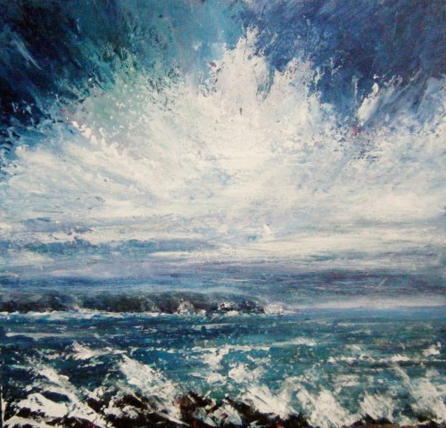 Well, after the last painting of poppies in a hot dry cornfield, and before that a calm bluebell wood scene, I am back to stormy skies and surging seas! It should make a good pair for my other seascape, “Storm Brewing”
