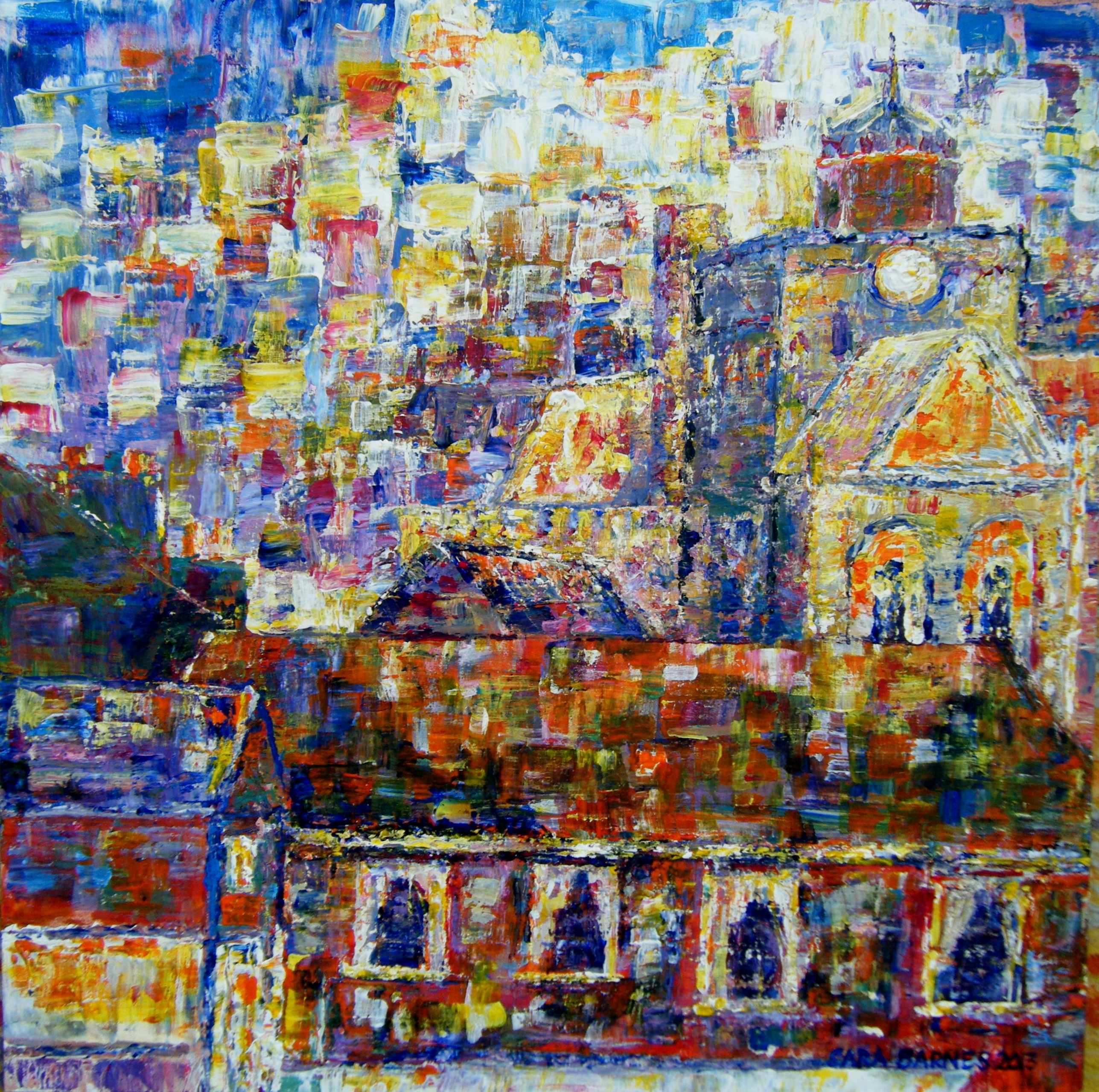 This abstract of Romsey Rooftops is one of the chosen paintings. See you at the gallery….. Love SaraX